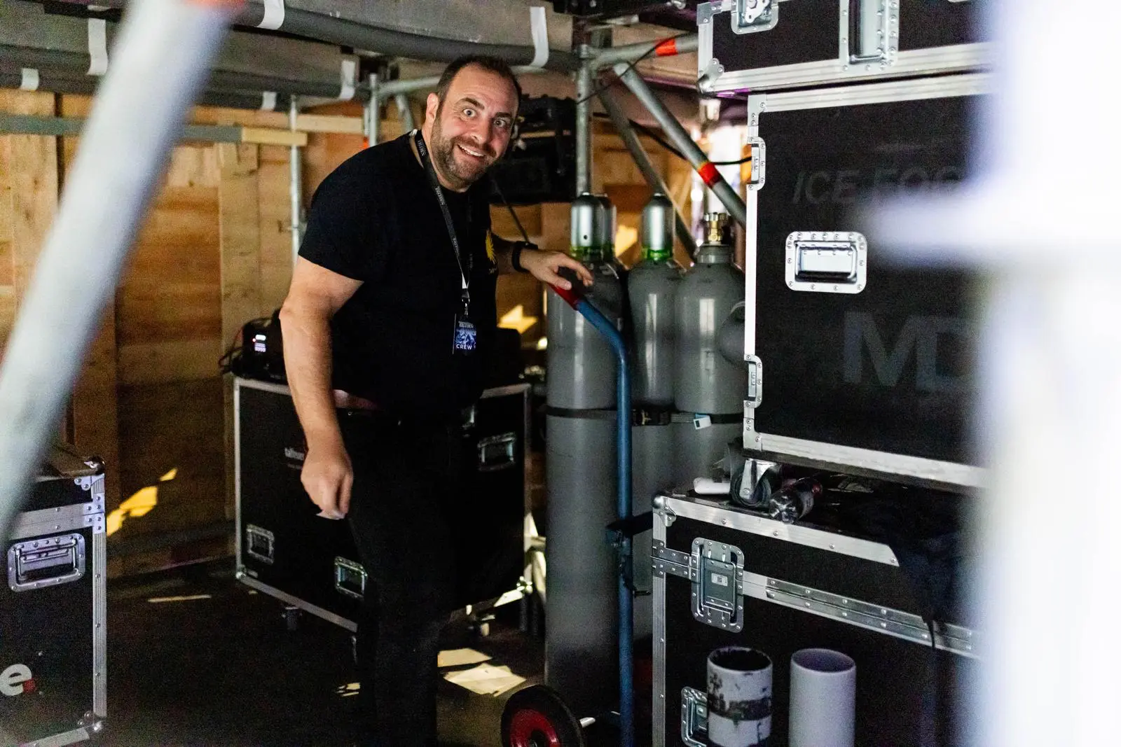 PS: Die Bilder zeigen mich während der Show unter der Bühne. Einmal beim Bedienen der Scherenbühne, die im perfekten Moment hoch- und runterfahren muss. Einmal beim Auffüllen der CO2-Flaschen für den Nebel. Wer hätte gedacht, dass ich mal per Intercom Anweisungen vom Showcalling bekomme und in Sekundenschnelle reagieren muss? Man wächst eben mit seinen Aufgaben.